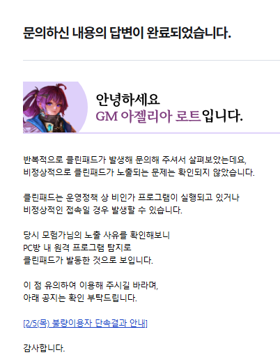 똑같이 클린패드 방마다 떠서 문의 바로 남겼는데 신기하게도 그 뒤로 안 뜨길래 해결 된 줄 알고 계속 게임하다 나왔는데