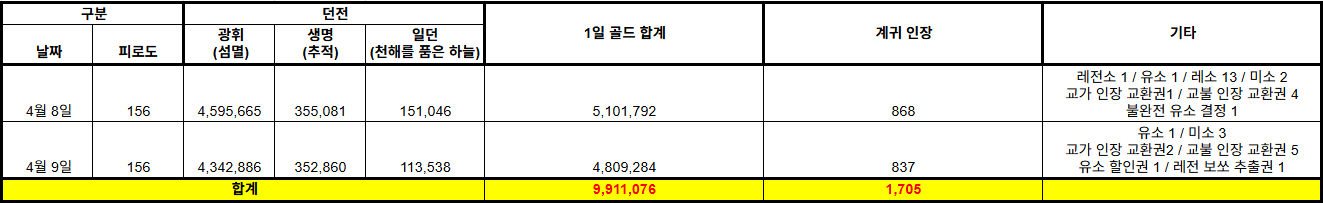세 던전마다 특징이 달라서 순수 골드만 비교해 보기로 했습니다.