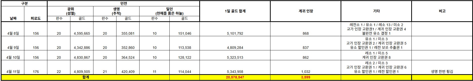 세 던전마다 특징이 달라서 순수 골드만 비교해 보기로 했습니다.