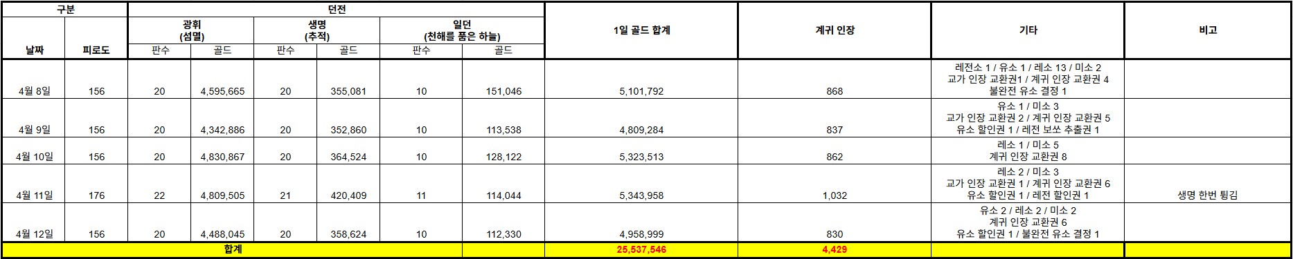 세 던전마다 특징이 달라서 순수 골드만 비교해 보기로 했습니다.