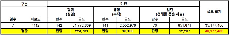 세 던전마다 특징이 달라서 순수 골드만 비교해 보기로 했습니다.
