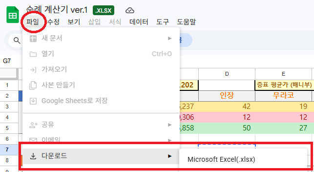 계산용 시트랑 통계용 시트 두가지가 있는데 계산용 시트 사용하시면 됩니다.