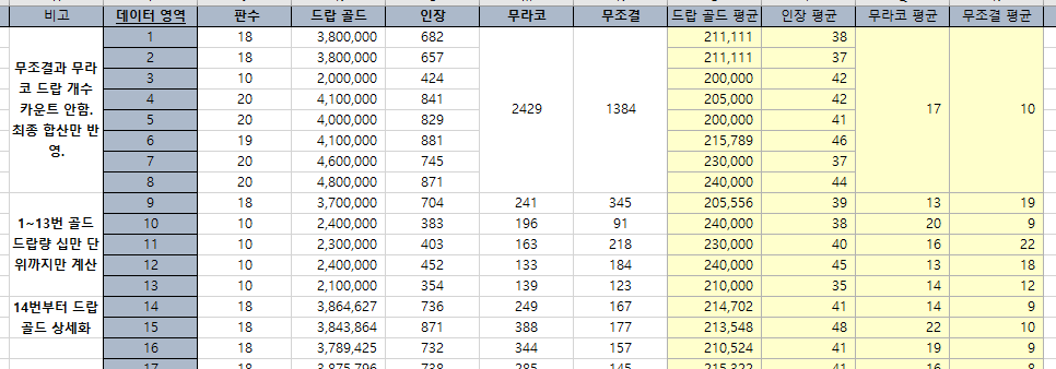 데이터 1~13번까지 200판 정도는 이렇게까지 할 생각이 없었어서 통계를 제가 대충 낸 부분이 존재합니다.