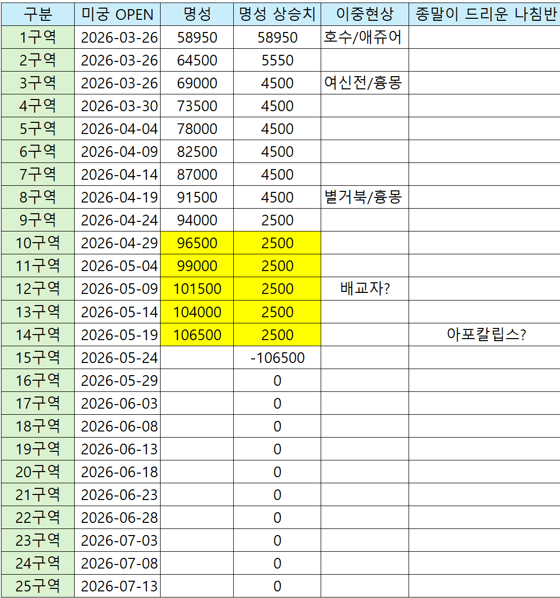※ 미궁 OPEN일은 조사권(돋보기)으로 열어볼수 있는날 기준 입니다.