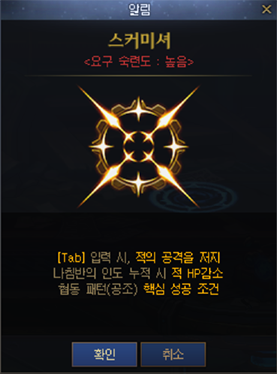 표식과 충돌하게 될 경우 패턴이 파훼 됩니다. 스커미셔 효과는 쿨타임과 횟수 제한 없이 사용 가능합니다.