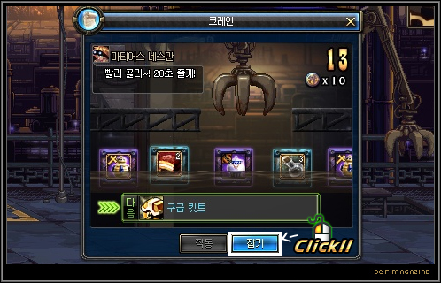 잡기 버튼을 눌러 크레인으로 아이템을 집을 수 있습니다.