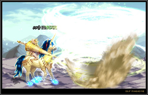 십자 베기 후 날아올라 천마 페가수스에 탑승 후 지상의 적을 강타하여 멸한다. |