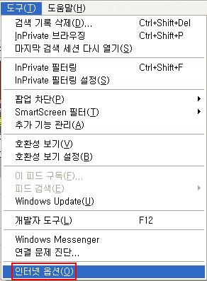 1. Internet Explorer의 메뉴 '도구->인터넷 옵션’ 클릭