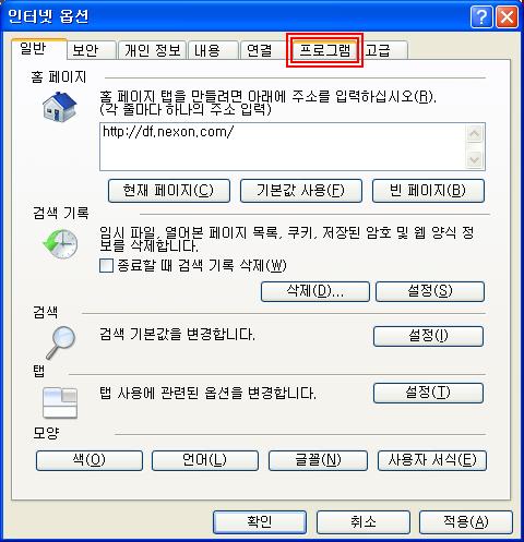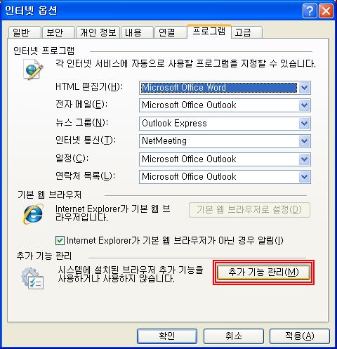 2. ‘인터넷 옵션->프로그램’ 클릭