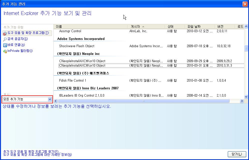 2. 목록 중에서 CNeopleInstallAXCtlKor10 Object를 제거 합니다.(해당 이름이 여러 개 있을 경우 모두 제거해 주시기 바랍니다.)