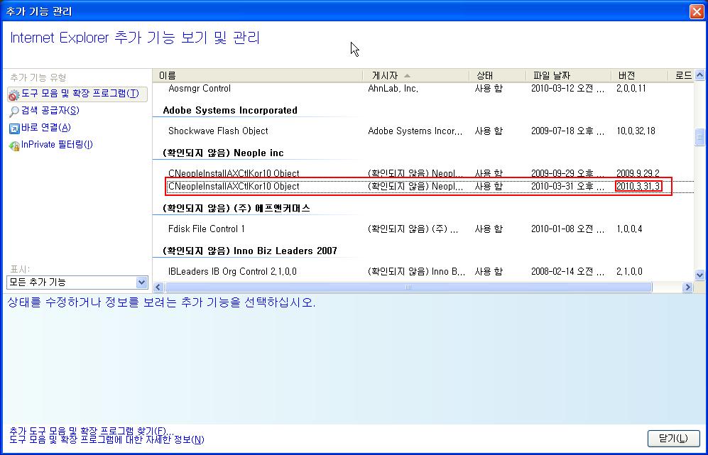 5. Neople Inc 목록에서 “CNeopleInstallAXCtlKor10 Object”중 버전 2010.3.31.3 을 더블클릭