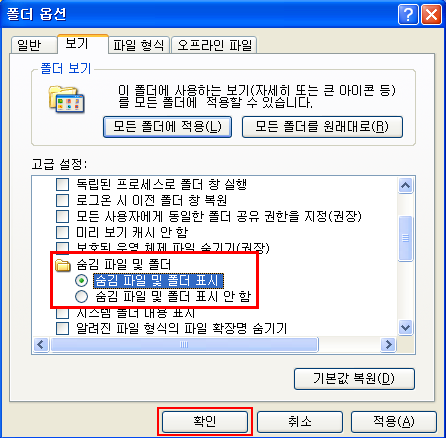 확인(폴더옵션에서 숨김 파일을 모두 보기로 전환한 다음 확인해야 합니다.)