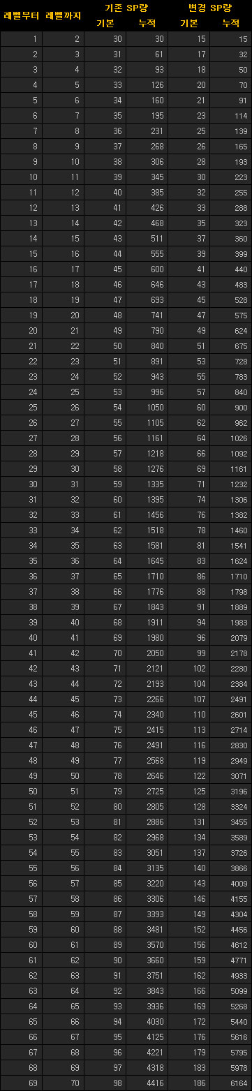 - 저레벨 스킬의 필요 SP량은 감소, 고레벨 스킬의 필요 SP량은 증가됩니다.