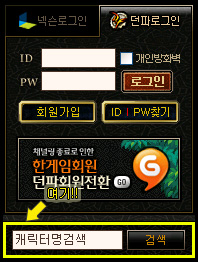 <로그인 창 하단에 검색할 캐릭터 이름을 적고 [검색] 버튼을 누르세요>