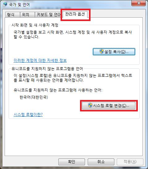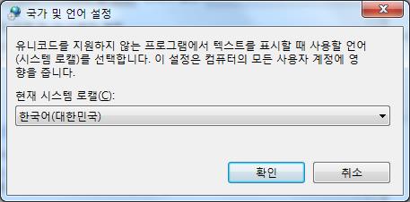 1) 제어판 -> 국가 및 언어 선택 -> 관리자 옵션 -> 시스템 로캘 변경 선택