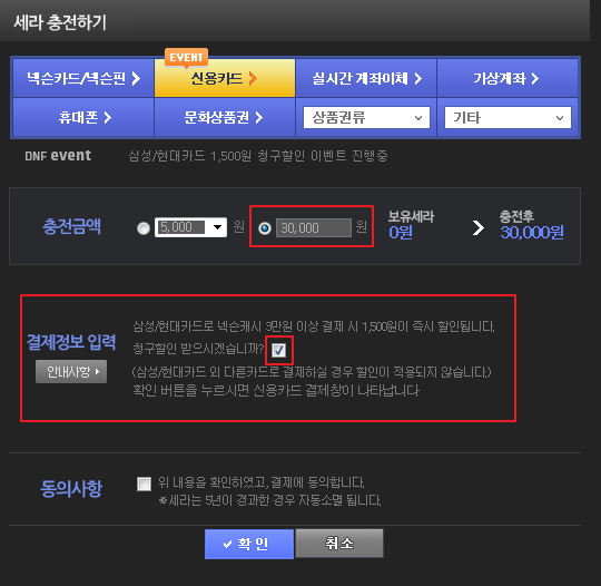 - 세라 충전창에서 신용카드 선택 > 충전 금액 3만원 이상 선택 > 이벤트 참여 체크