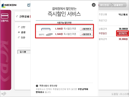 - 신용카드 충전창에서 할인 받기 클릭 > -1500원 차감 결제 금액 확인