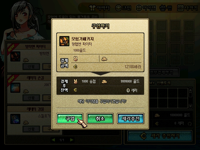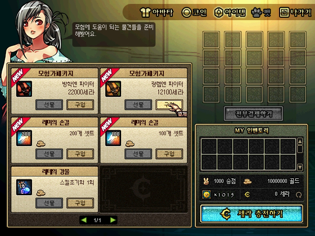 아래와 같이 세라샵의 아이템 탭에서 구매할 모험가 패키지를 선택하신후 구매하시면 됩니다.
