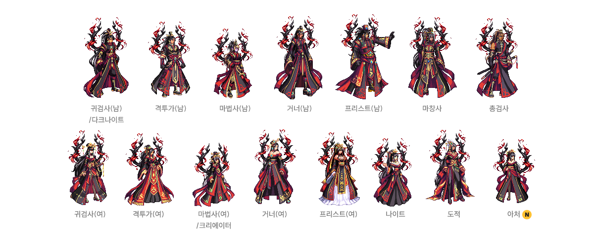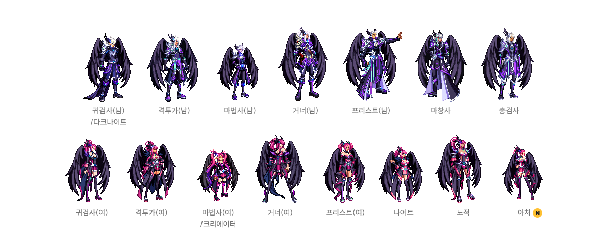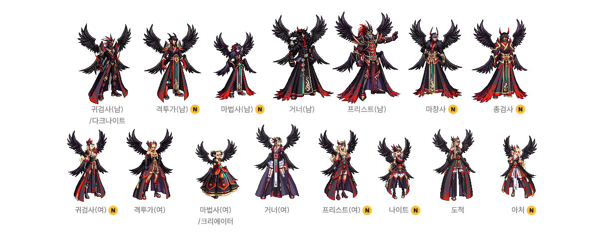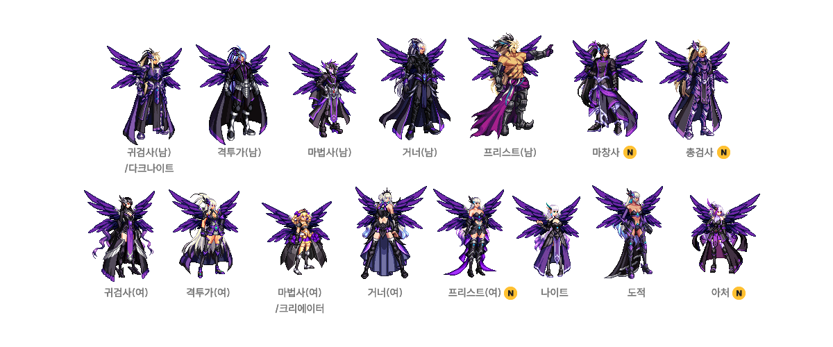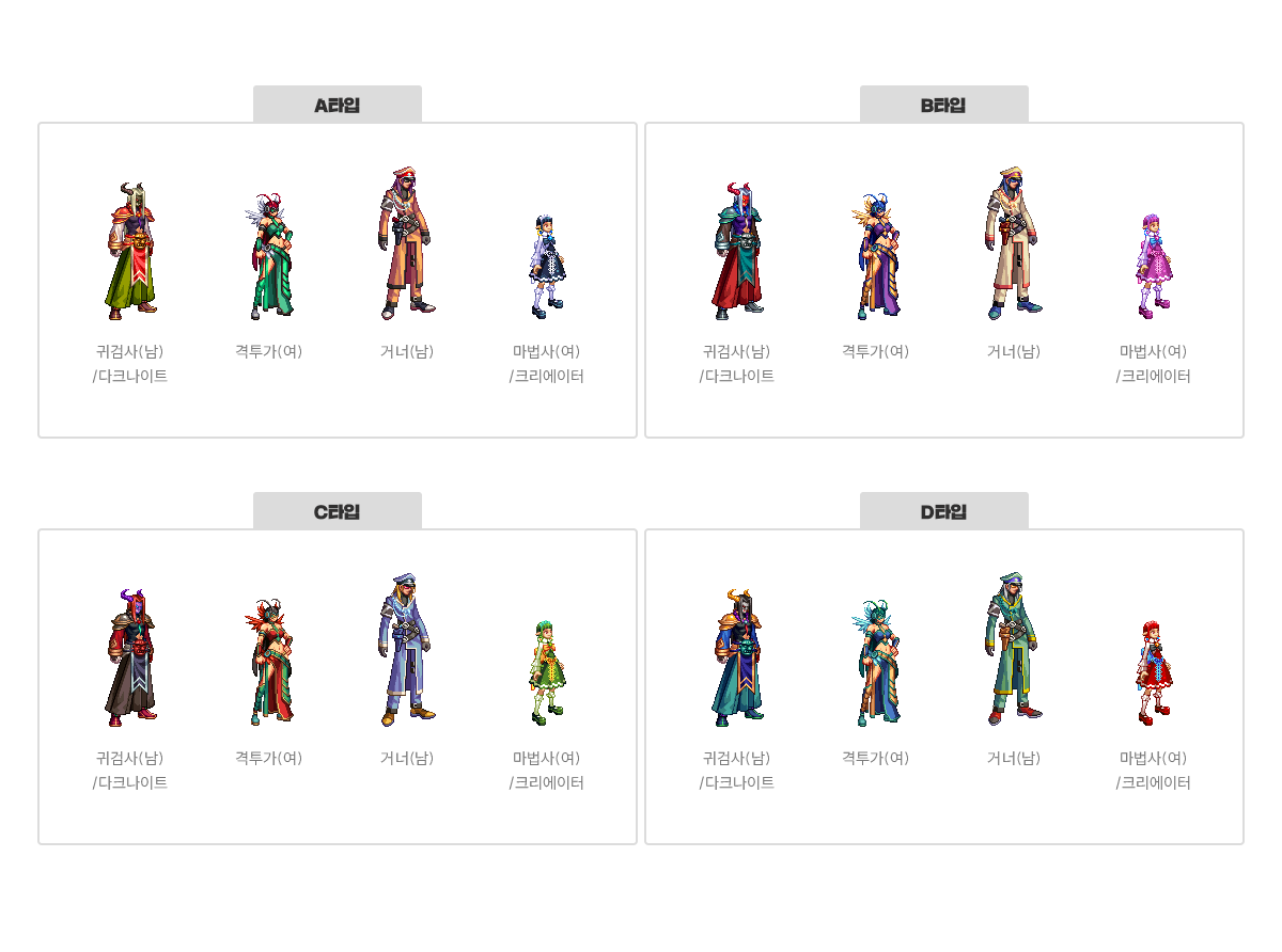 귀검사(남), 격투가(여), 거너(남), 마법사(여) - A/B/C/D 타입