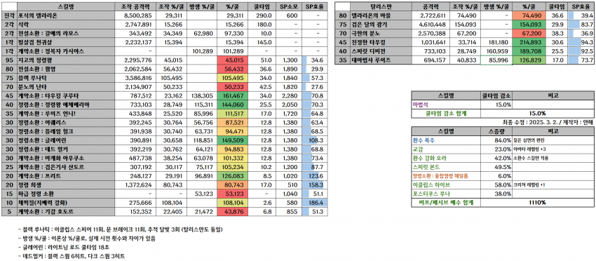 - 70제 : 위 표 딜/쿨 참조 + 쿠루타 마비- 80제 : 위 표 딜/쿨 참조