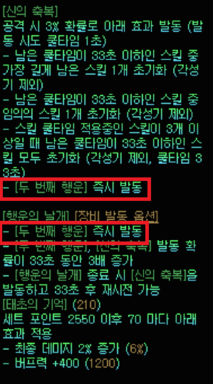 입장 시 [두 번째 행운] 즉시 발동 효과는 던전 입장 시 1회성으로 33초간 발동되는 옵션입니다.