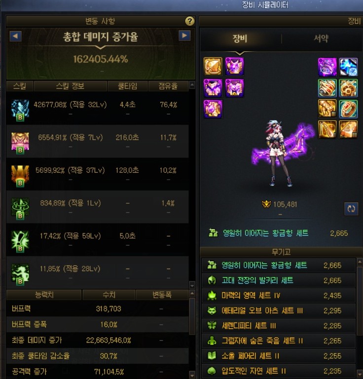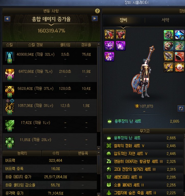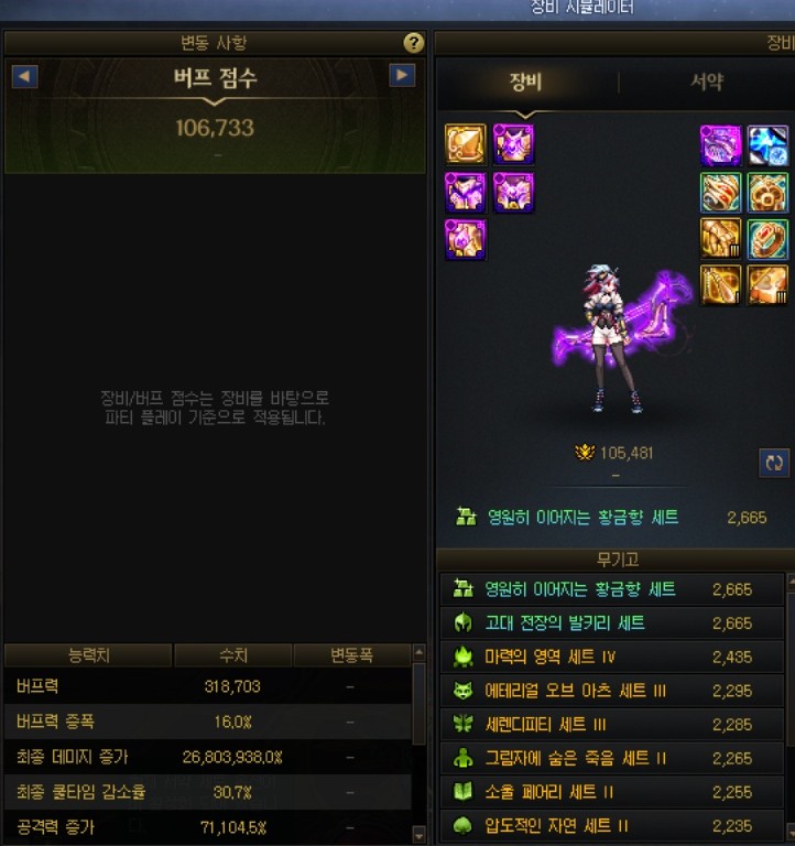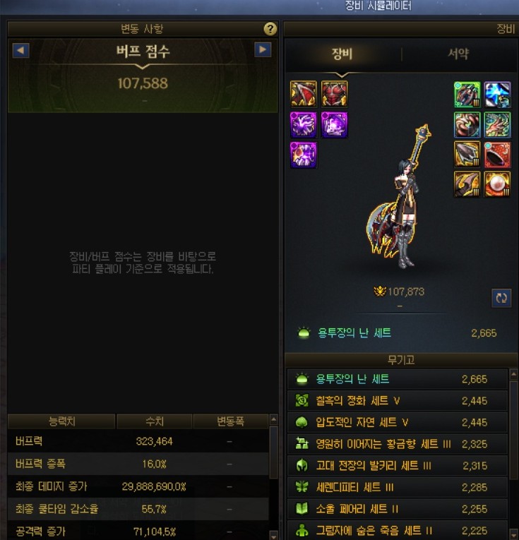 라핌 장비 버프점수 107,588 / 총합 데미지 증가율 160,319.47%(진각6472.66%)