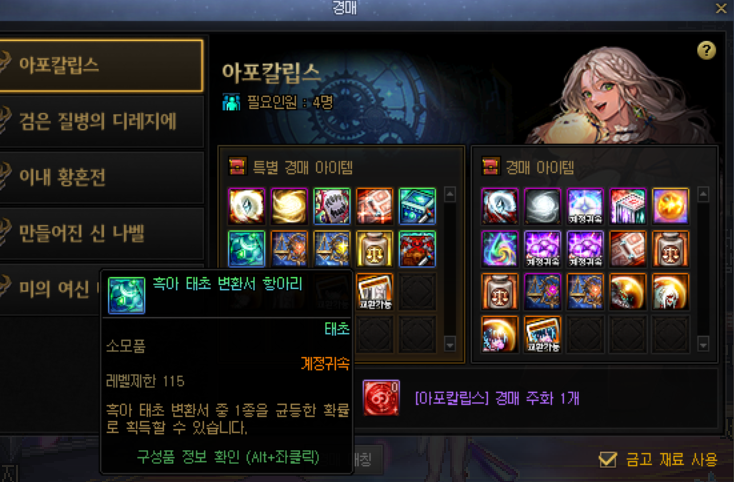 아포칼립스 보상으로 흑아변환서 를 완화한다고 하셨었는데 '항아리, 랜덤변환서' 두개 를 "특별경매" 로 넣으셨습니다