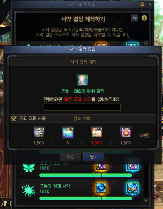 하지만 중천의 장비, 천해천의 서약 결정은 확실하게 얻을 방법이 없었고 천해천의 역설의 미궁에서 가끔 수급이 가능한 상태이고