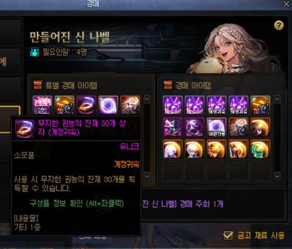 나벨 경매에는 더이상 사용처가 계시 1:1 교환밖에 없는 잔재가 "특별경매" 품목에 들어가 있습니다