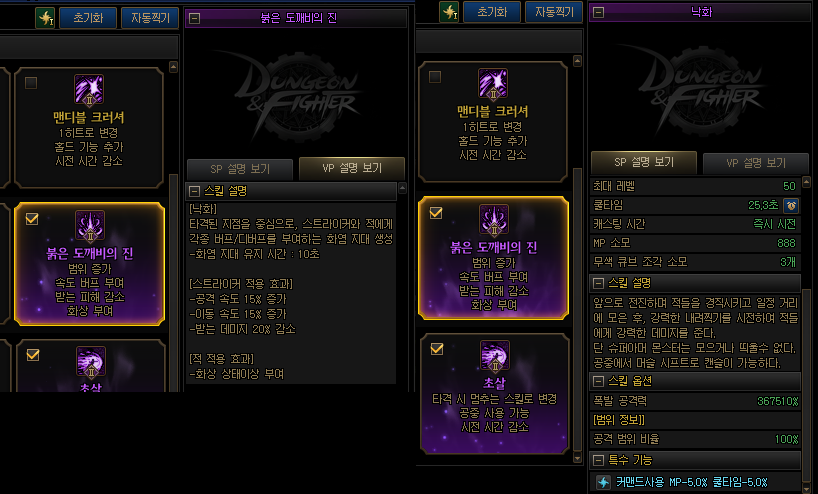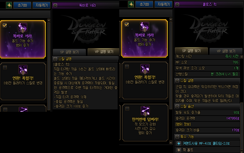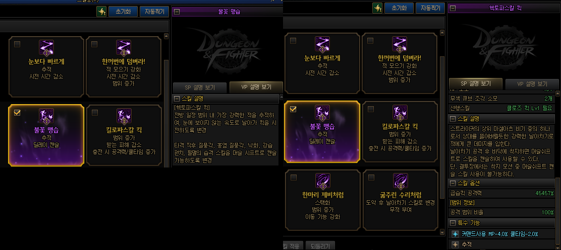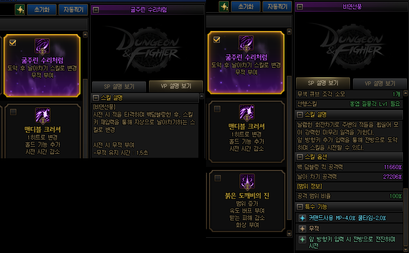 비연선풍(굶주린 수리처럼) - 무적 기능 반영 + 스킬 옵션도 백 덤블링, 날아 차기라는 프로세스 변경에 맞는 이름으로 바뀜