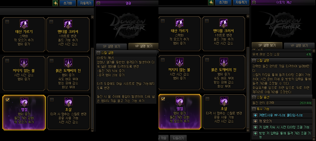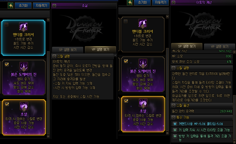 아토믹 캐넌(초살) - 키 입력 지속 시 시전 타이밍 조절 기능, 방향 키 입력을 통해 돌격 거리 조절 가능
