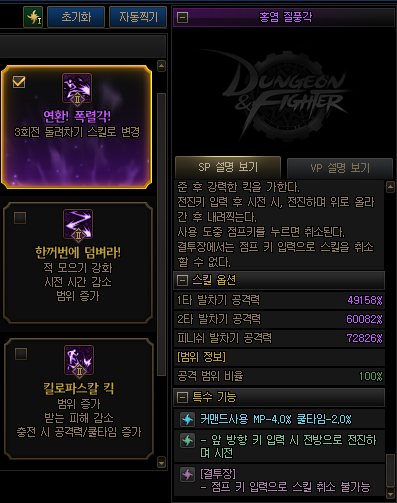 홍염 질풍각(연환! 폭렬각!) - 앞 방향 키 입력 시 전방으로 전진하며 시전 < 연환퇴로 바뀌면 없어지는 기능입니다