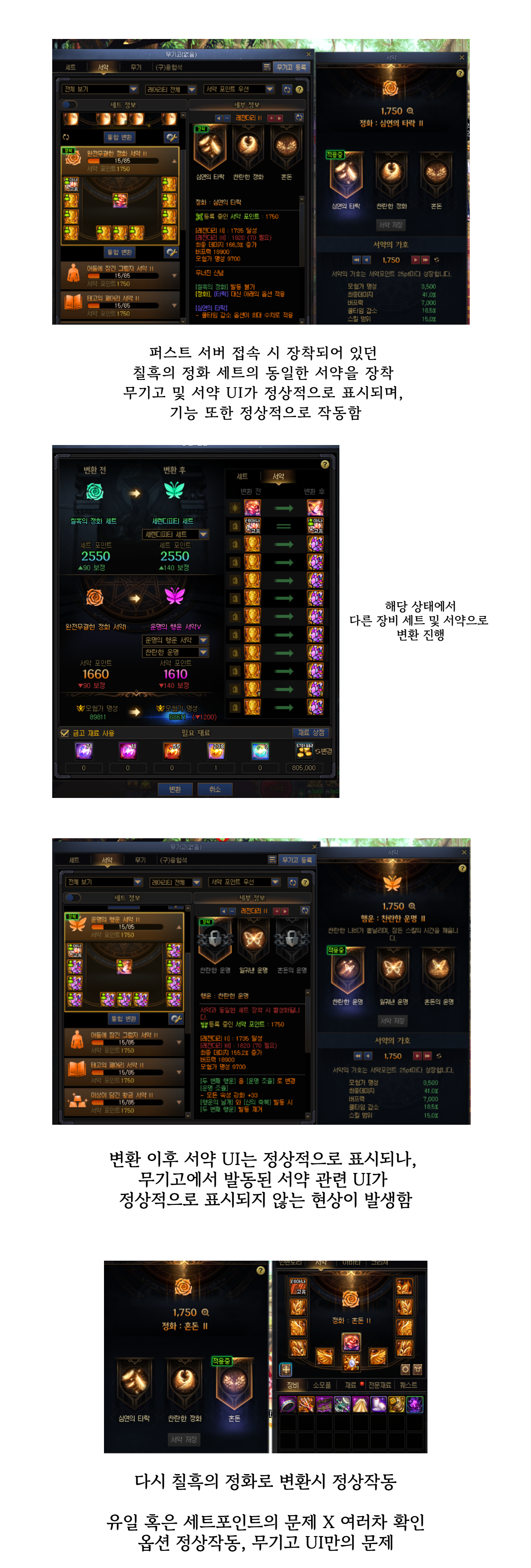 NPC 호감도 내리는 기능 다시 추가해주세요 제발요 40409 01:52 12 0 수정) 무리, 마력 에픽 결정 해체시 미광의 소울 갯수가 다릅니다. 리팸 00:10 19 0 [생명의 순례] 빛의 추적자 몬스터가 아군 몬스터로 나오는 현상 데스모이네스 2026.03.17 19 0 [시스템]장비변환 이용시 바뀐 서약의 명성 및 서약포인트 증가표시 유지 Sanso 2026.03.17 21 0 [상급던전]배교자의 성 솔플시 피통아래 창,방패 아이콘이 바뀌지 않는 현상 Sanso 2026.03.17 19 0 ㅅ발 천해천이고 나발이고 본섭 류심 커맨드 잠기는 것 좀 고쳐라 ㅆ1♡♥♥♡들아 쇠질꾼 2026.03.17 36 0 [별거북 대서고] 시나리오던전 퀘스트중에 던전포탈이 이동안되는버그 루피정훈 2026.03.17 20 0 세트 변환시 무기고UI가 정상적으로 작동하지 않는 현상 메리 2026.03.17 23 0 돈습득량 많아지는 버그 한리광 2026.03.17 32 2 던전 입장 후 장비 옵션 발동 상태에서 서약 장비 스위칭 시 옵션이 중복 적용되는 현상 메리 2026.03.17 28 0 [상급던전]첫 공격이 창 기믹인 경우 비올렌티아 입장시 예고 없음 Sanso 2026.03.17 34 0 [상급던전]배교자의 성 보스의 패턴 기믹 변경시 시스템 메세지 출력 Sanso 2026.03.17 29 0 [단축키] 서약 옵션 같이보기 단축키 미동작 븜망겜 2026.03.17 21 0 [상점] 휴 피츠래리 무한화서 상점에 솔리드 소울 누락 2022.04.15 2026.03.17 28 0 [모험단] 콘텐츠 현황 오류 2022.04.15 2026.03.17 35 0 [토벌권] 계시 : 천해를 품은 하늘 토벌권 사용시 업적 횟수 미적용 및 다른버그 2022.04.15 2026.03.17 32 0 [모험 길라잡이] 콘텐츠 가이드 문제점 정리 2022.04.15 2026.03.17 42 0 [조율의 경계] 서약 장비 드랍 이펙트의 부재 2022.04.15 2026.03.17 34 0 [서약] 단일 서약 포인트 미보유 시 세트포인트 보정이 작동하지 않는 문제 븜망겜 2026.03.17 33 0 NPC 호감도 버그 제보합니다. 간단한 거니까 제발 고쳐주세요 40409 2026.03.17 43 0