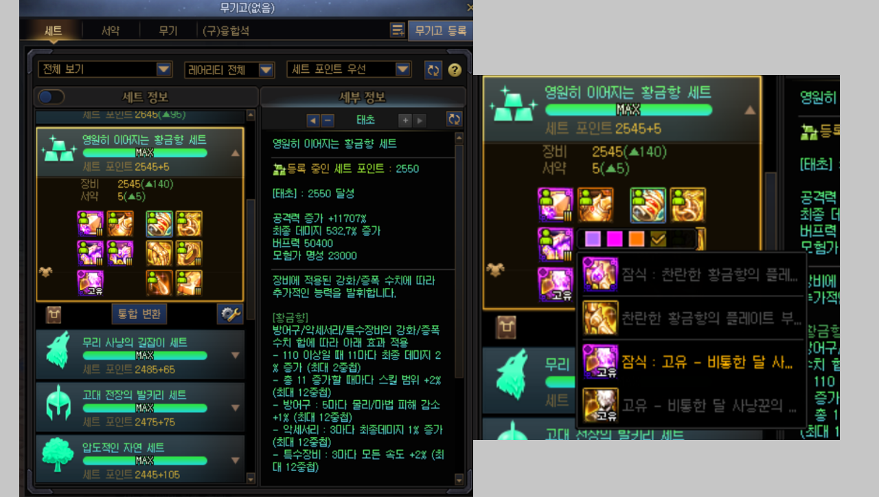 - 무기고 탭에서 세트 장비가 고유 장비보다 등급이 더 낮을 경우, 상위 등급의 고유 장비가 자동적으로 노출되며 변환 시 고유 장비로 변환함.