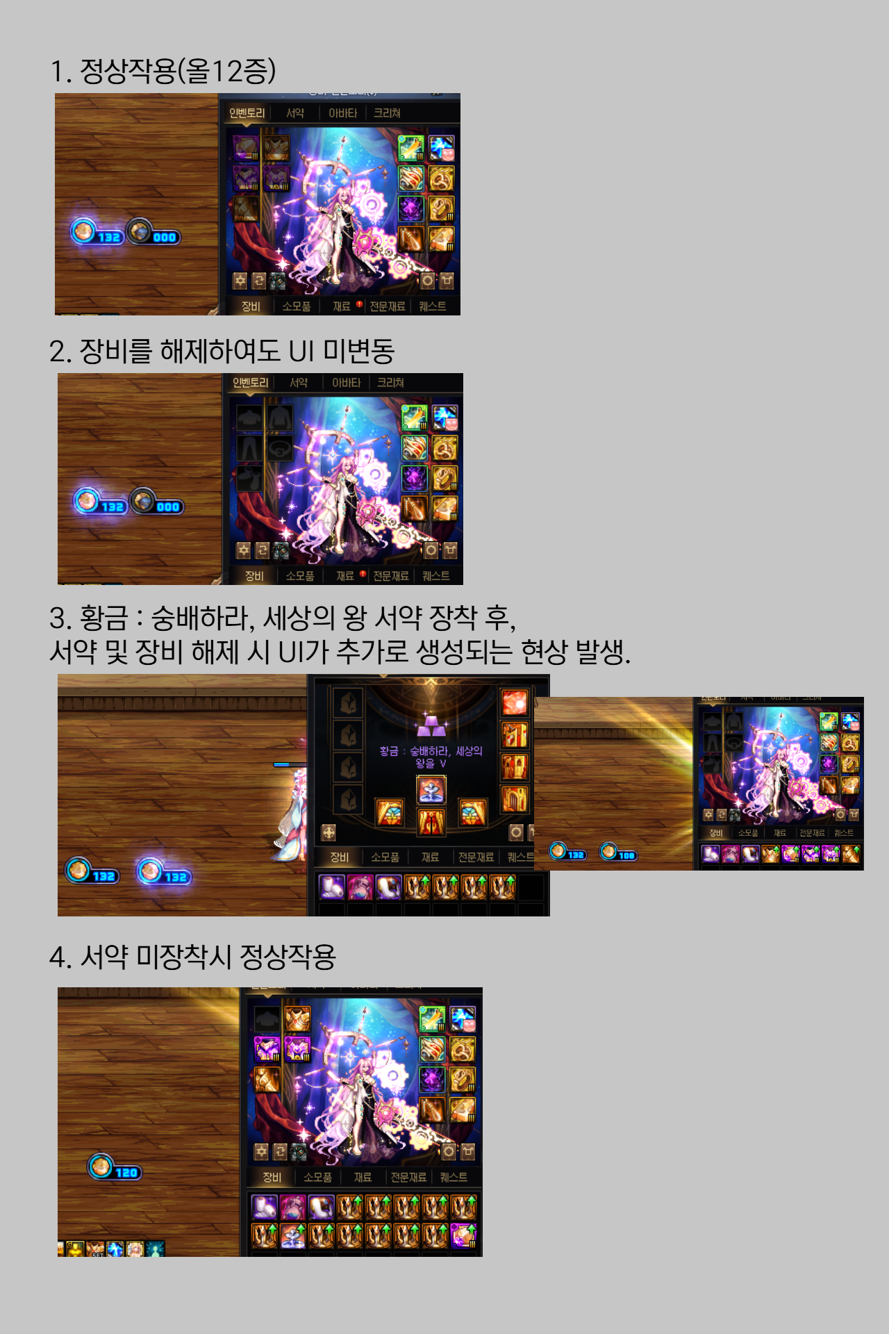 3. ‘황금: 숭배하라’ 서약 사용 후 장비 및 서약을 해제할 경우, UI가 추가로 생성되는 버그 발생.