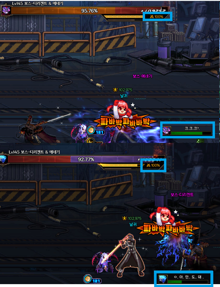제압 패턴 진행 시, 대미지 배율이 100%보단 높아야 할 것 같습니다.