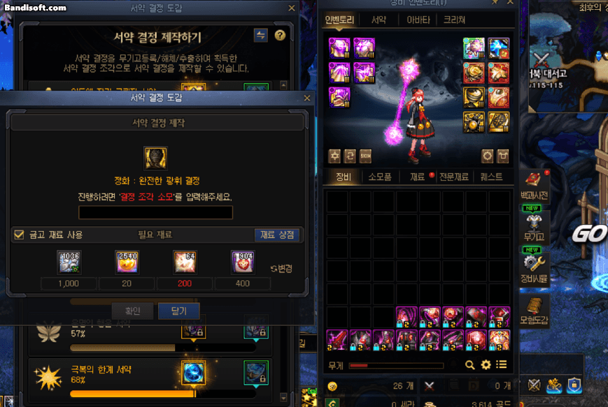 - 서약 결정 제작에 사용되는 재료인 [광휘의 소울] [순례의 인장] [에픽 소울] 등의 항목이 표시되어야함