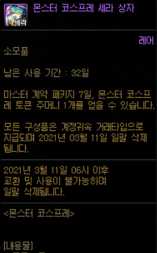 이번 내용은 판매 종료된 "몬스터 코스프레 세라상자" 를 이용한 "오라 엠블렘 이전기" 에 대한 내용입니다.