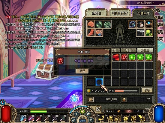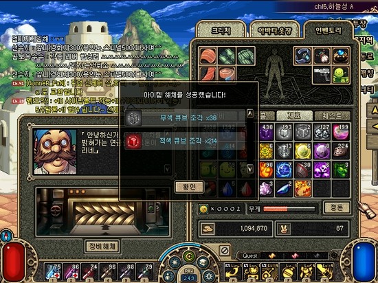 스샷 설명 = 흰큐 10개, 적큐10개 ,최상급연석 100개, 강철조각 100개, 테라니움 50개 (각성 재료)