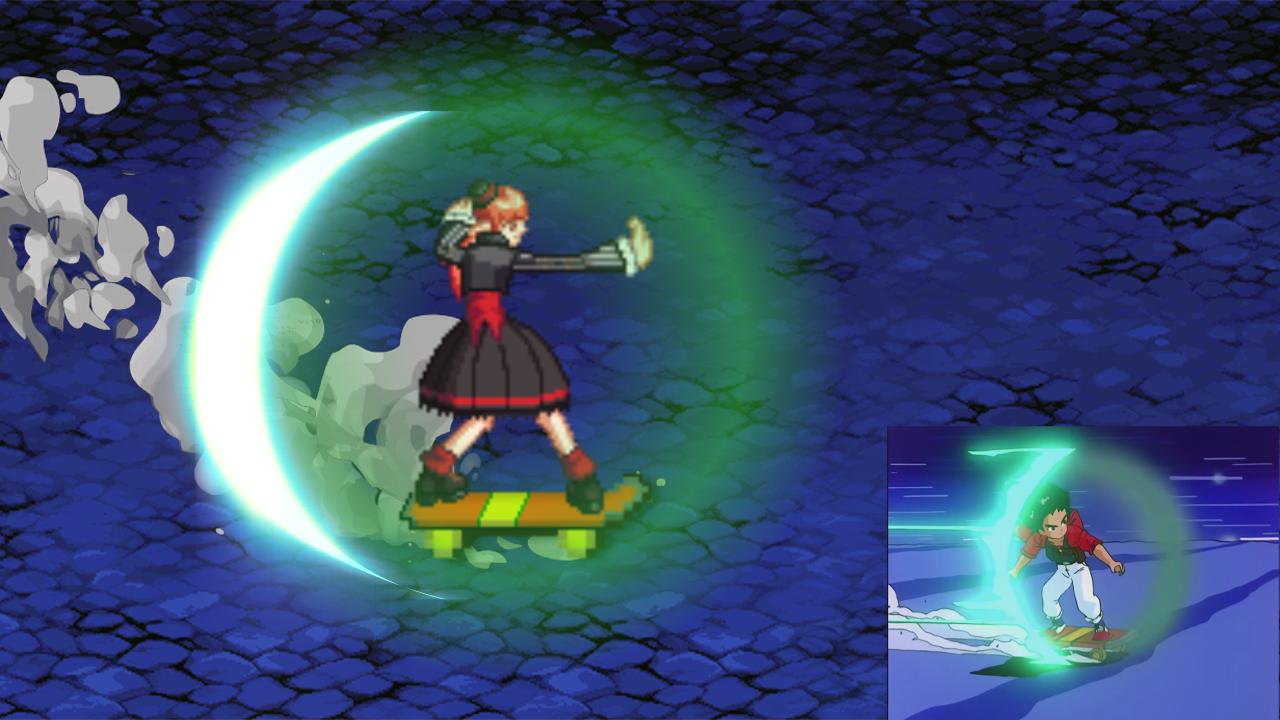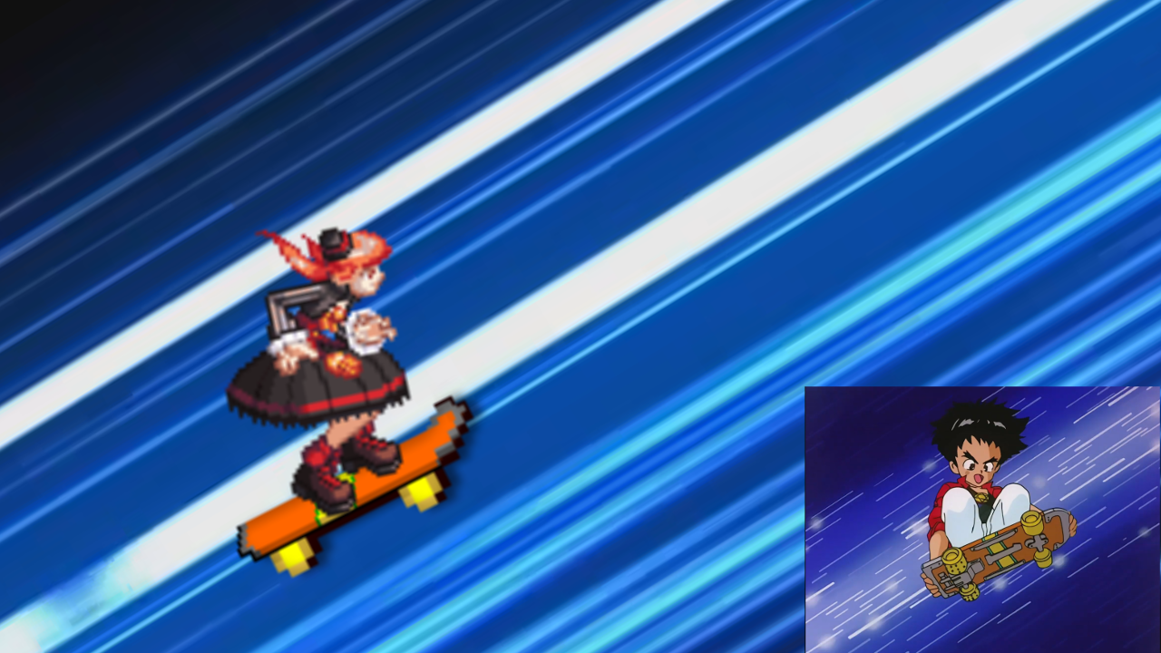 ▲ 보드 타는 븝미짱 (보드 도트는 고전겜 원더보이 도트를 칼라만 바꿔서 사용함)