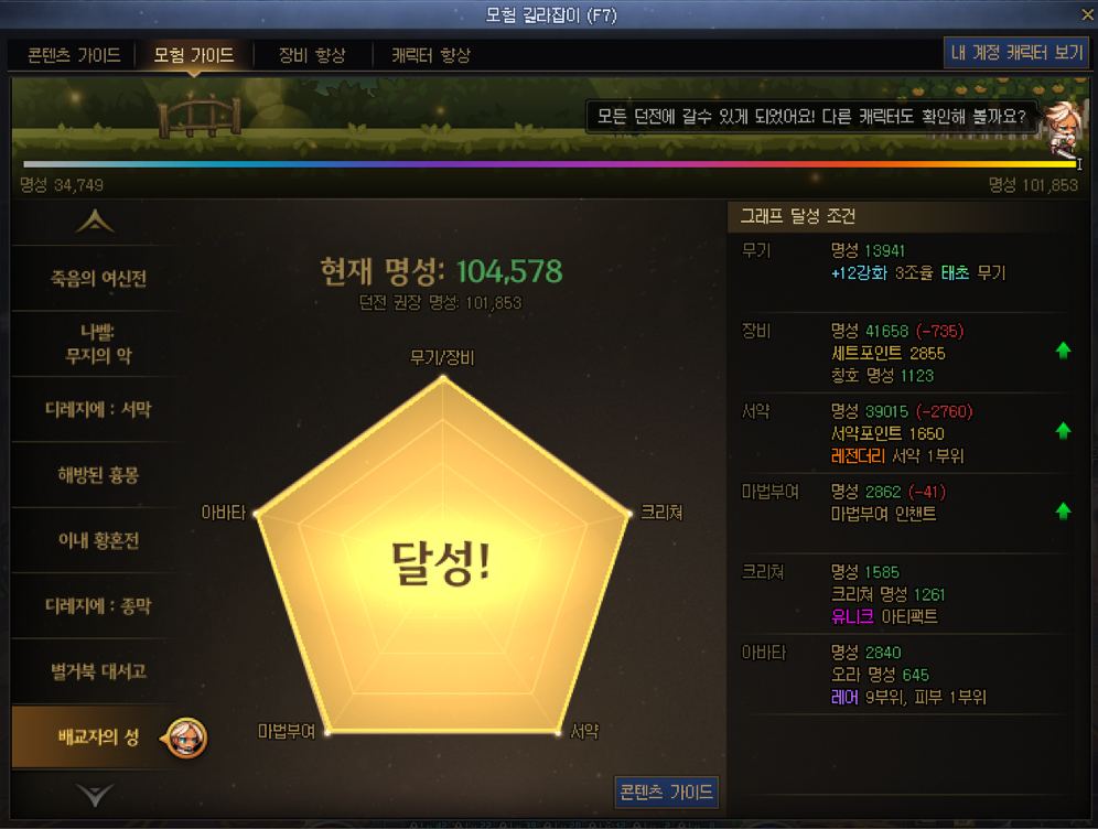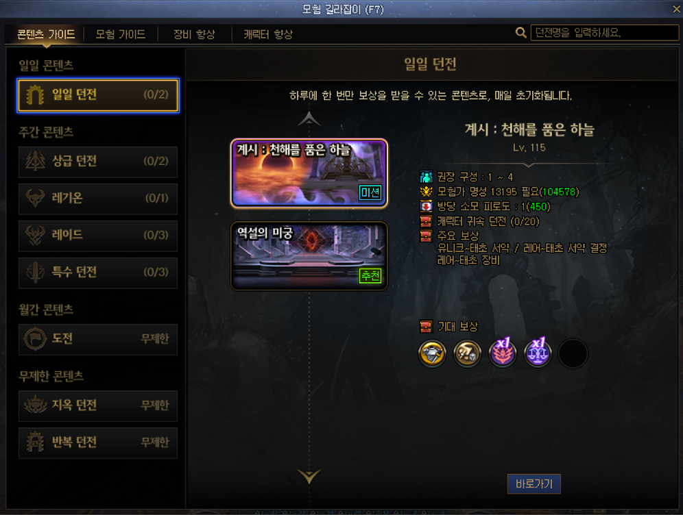 콘텐츠 가이드에서는 현재 캐릭터의 명성을 기준으로 플레이 가능한 던전 목록과 기대 보상, 던전별 퀘스트 목록 등을 확인할 수 있습니다.