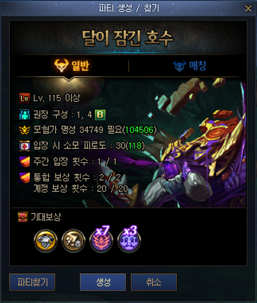 - NPC '달 사냥꾼 베즐로' 혹은 파티 찾기 UI의 파티 생성 버튼을 통해 생성이 가능합니다.