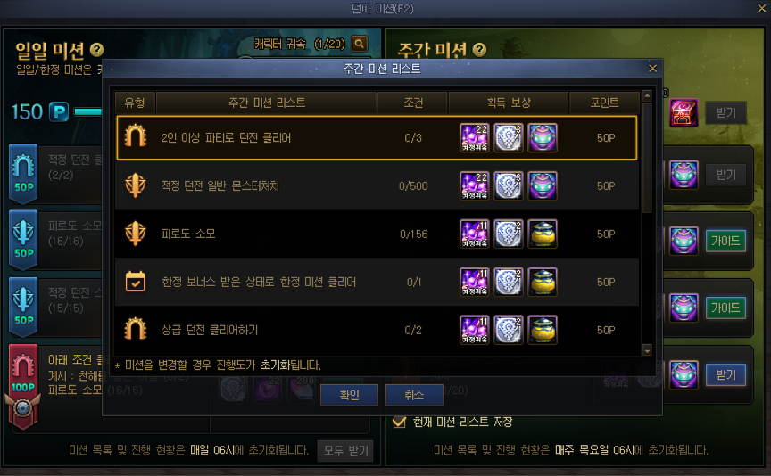 일일 미션은 계정당 20개 캐릭터까지 진행할 수 있습니다. (06시 초기화)