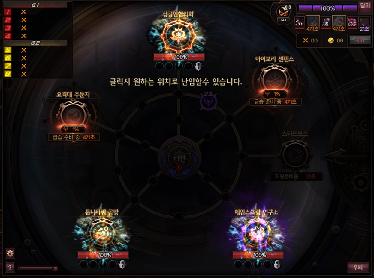 자신이 속한 그룹은 화면 상단 파티창에 표시되며, 반대편 그룹은 화면 좌측 전용 UI로 표시됩니다.